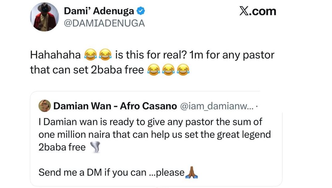 Nigerian Afro-pop artist, Damian Wan (Afro Casano) has publicly offered ₦1 million to any pastor who can set 2Baba free amid his marital crisis.