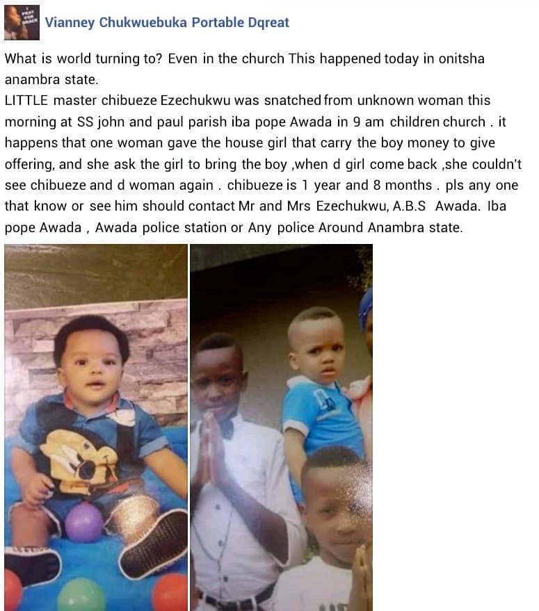 LITTLE master chibueze Ezechukwu was snatched from unknown woman this morning at SS john and paul parish iba pope Awada in 9 am children church . it happens that one woman gave the house girl that carry the boy money to give offering, and she ask the girl to bring the boy ,when d girl come back ,she couldn’t see chibueze and d woman again . chibueze is 1 year and 8 months . pls any one that know or see him should contact Mr and Mrs Ezechukwu, A.B.S Awada. Iba pope Awada , Awada police station or Any police Around Anambra state.”