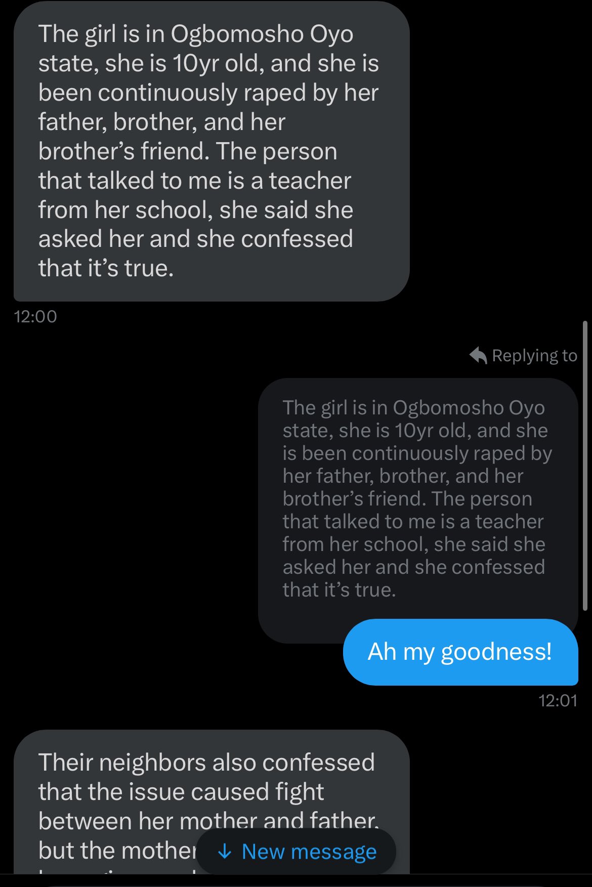 “The girl is in Ogbomosho Oyo state, she is 10yr old, and she is been continuously raped by her father, brother, and her brother’s friend. The person that talked to me is a teacher from her school, she said she asked her and she confessed that it’s true.”