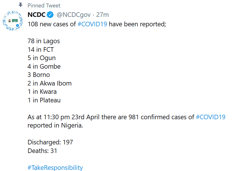 As at 11:30 pm 23rd April, there are 981 confirmed cases of COVID-19 reported in Nigeria. Discharged: 197, Deaths: 31