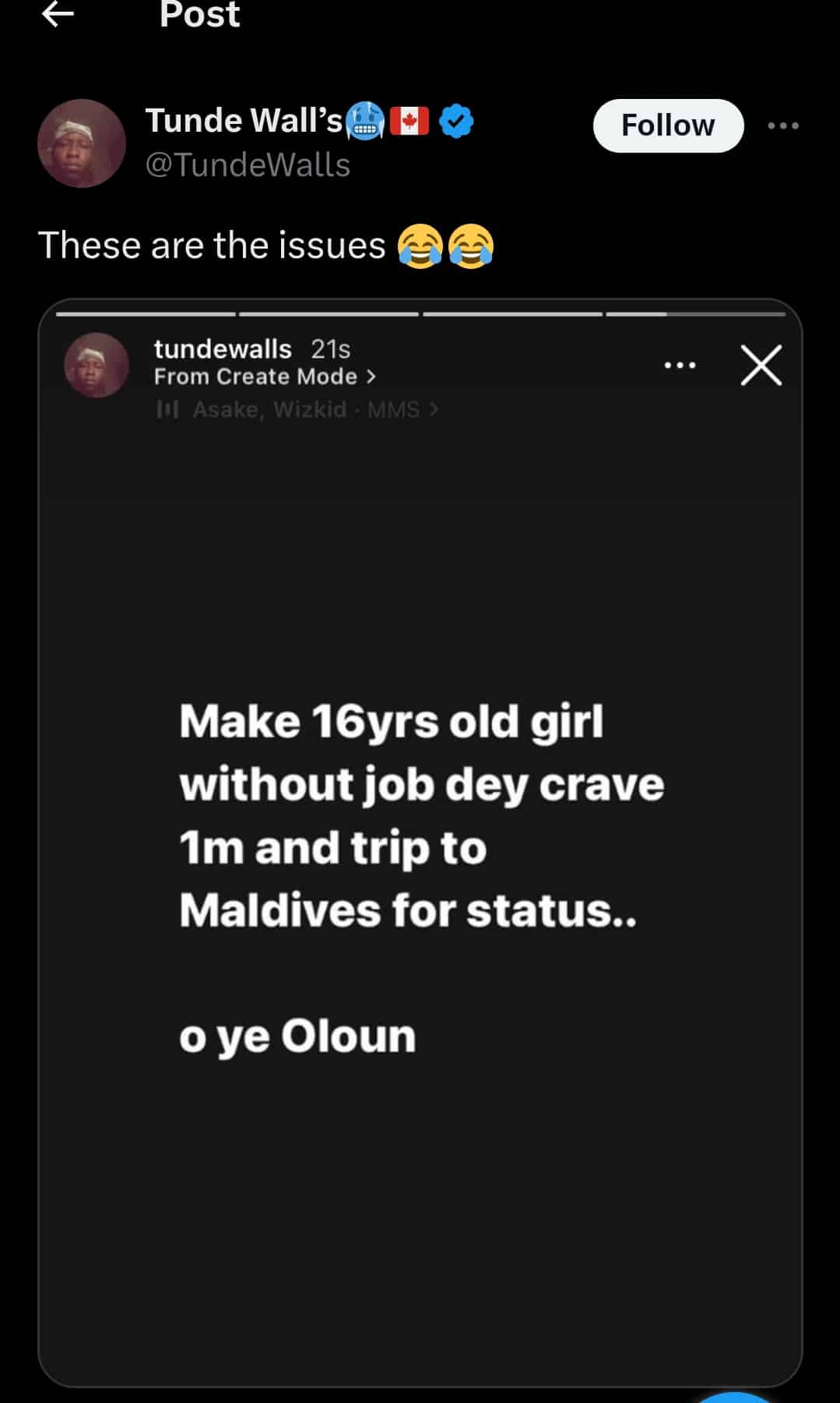 The user who shared the post wrote: “Make 16-year-old girl without a job dey crave ₦1m and a trip to the Maldives for status.”