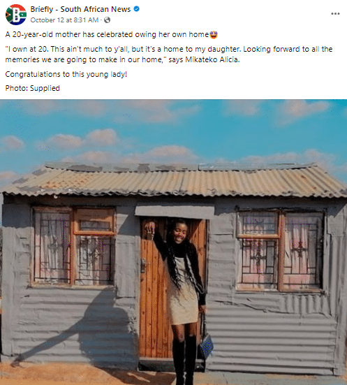 “I own at 20. This ain’t much to y’all, but it’s a home to my daughter. Looking forward to all the memories we are going to make in our home,” said Mikateko Alicia, the post caption read.