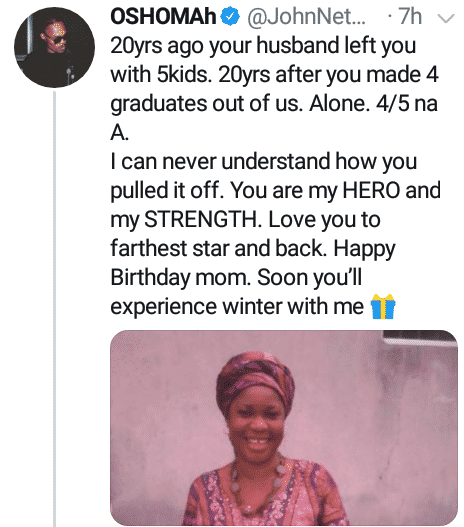 A Warri-born Engineer, John took to Twitter to celebrate his mother on her birthday and revealed how she single handedly trained four of her five children.