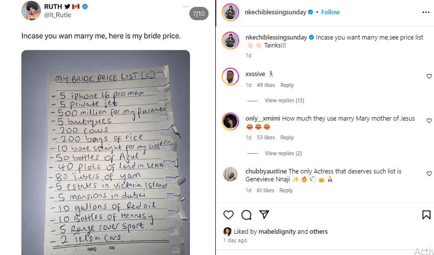She took to her Instagram page to repost a photo capturing the list of items that a netizen had written as her bride price.