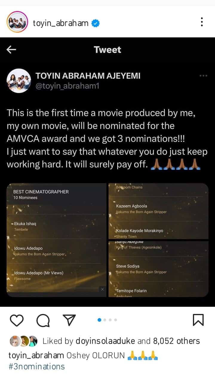 “This is the first time a movie produced by me, my movie, will be nominated for the AMVCA award and we got 3 nominations!? I just want to say that whatever you do just keep working hard. It will surely pay off. Oshey Olorun,” she wrote.