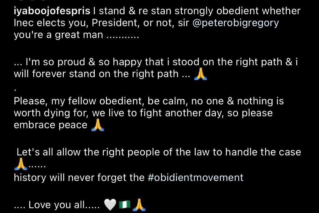 “I stand & re stan strongly obedient whether Inec elects you, President, or not, sir @peterobigregory you’re a great man..I’m so proud & so happy that I stood on the right path & I will forever stand on the right path … 🙏
