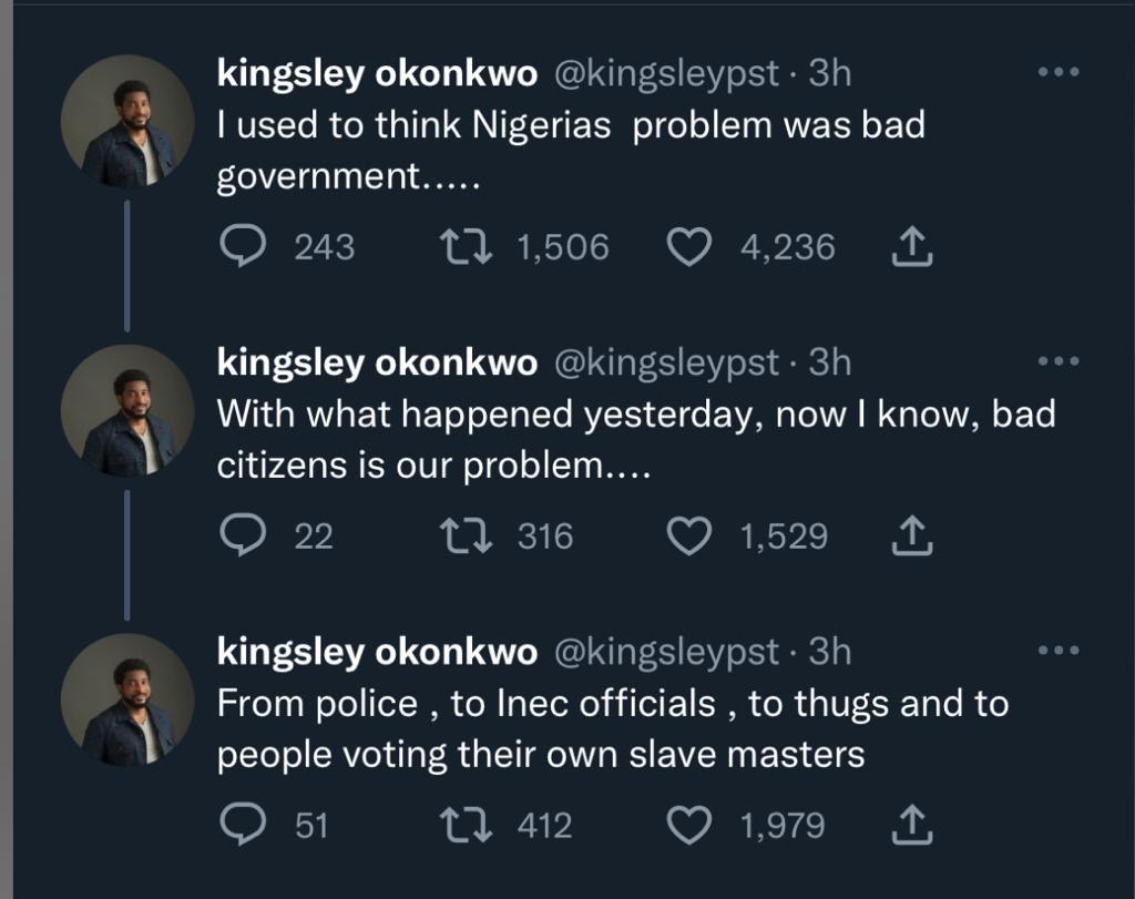 “I used to think Nigerias problem was bad government With what happened yesterday, now I know, bad citizens is our problem…. From police , to Inec officials , to thugs and to people voting their own slave masters “