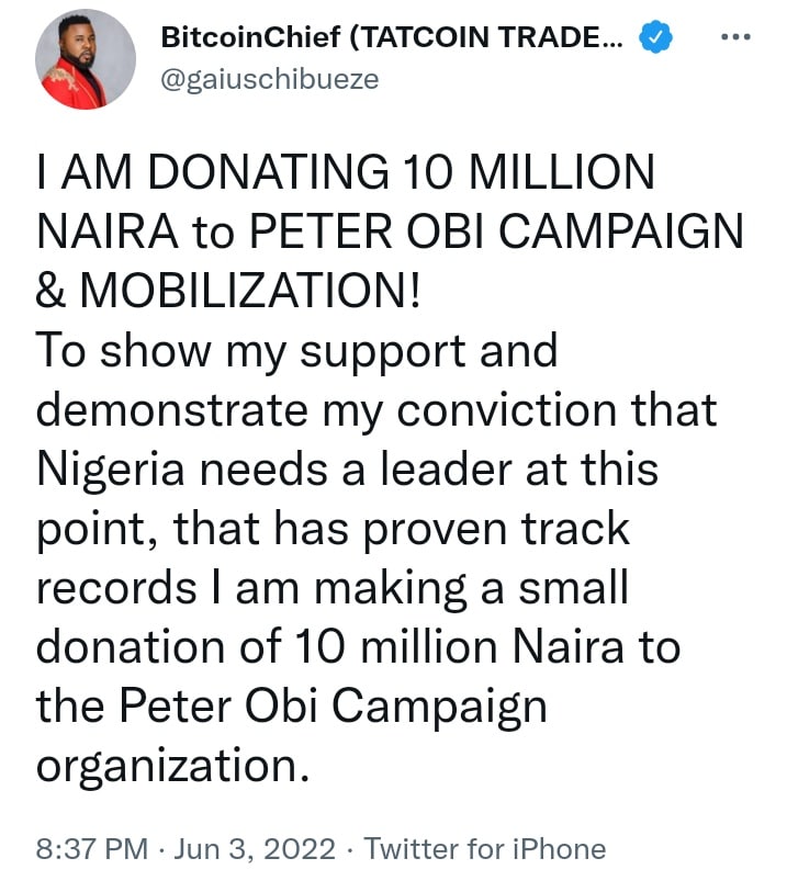 “To show my support and demonstrate my conviction that Nigeria needs a leader at this point, that has proven track records I am making a small donation of 10 million Naira to the Peter Obi Campaign organization.