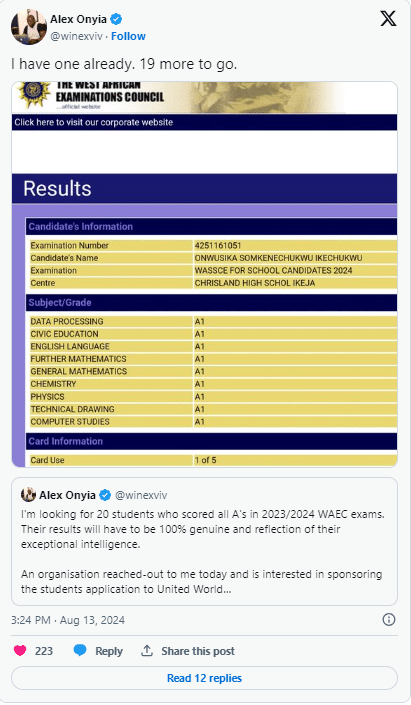 Alex Onyia also mentioned that he had selected Onwusika as one of the 20 students he intends to mentor and support in securing possible scholarships.