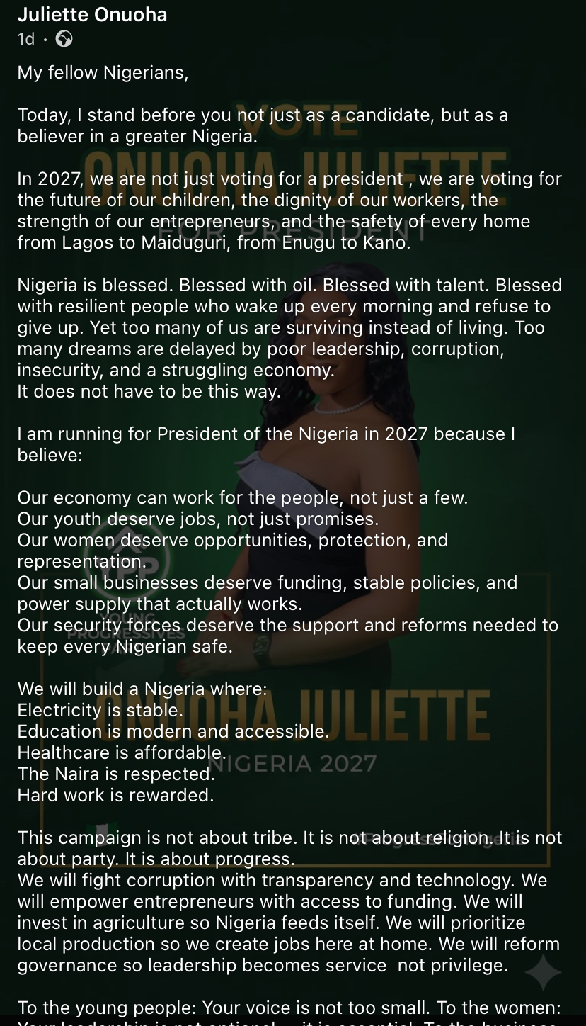 In a longer message addressed to Nigerians, Juliet framed her ambition as more than a personal political pursuit. She described it as a movement aimed at reshaping Nigeria’s future.