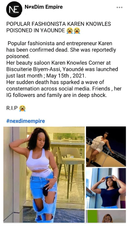 Reports indicate that Karen, known for her entrepreneurial spirit and successful fashion ventures, was celebrating the opening of her new business with friends in Yaoundé.
