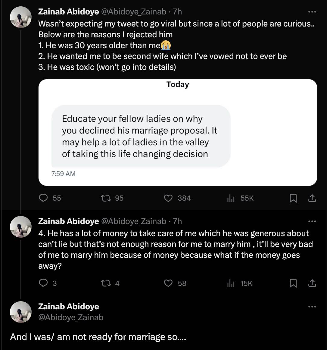 He has a lot of money to take care of me which he was generous about can’t lie but that’s not enough reason for me to marry him , it’ll be very bad of me to marry him because of money because what if the money goes away?” she added.