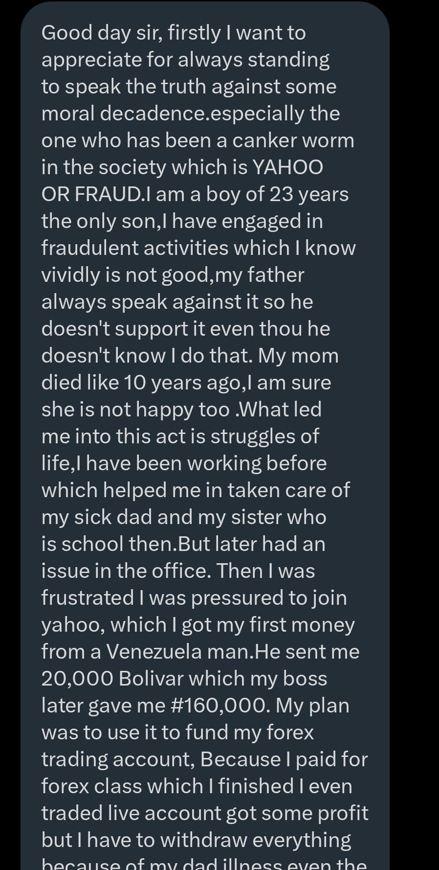 @Emephron_nwaego: “The day I saw my retired civil servant dad scammed of the little money in his account through phone calls and I saw how his mood changed and he just couldn’t breathe properly. I saw not to ever engage in fraud.”
