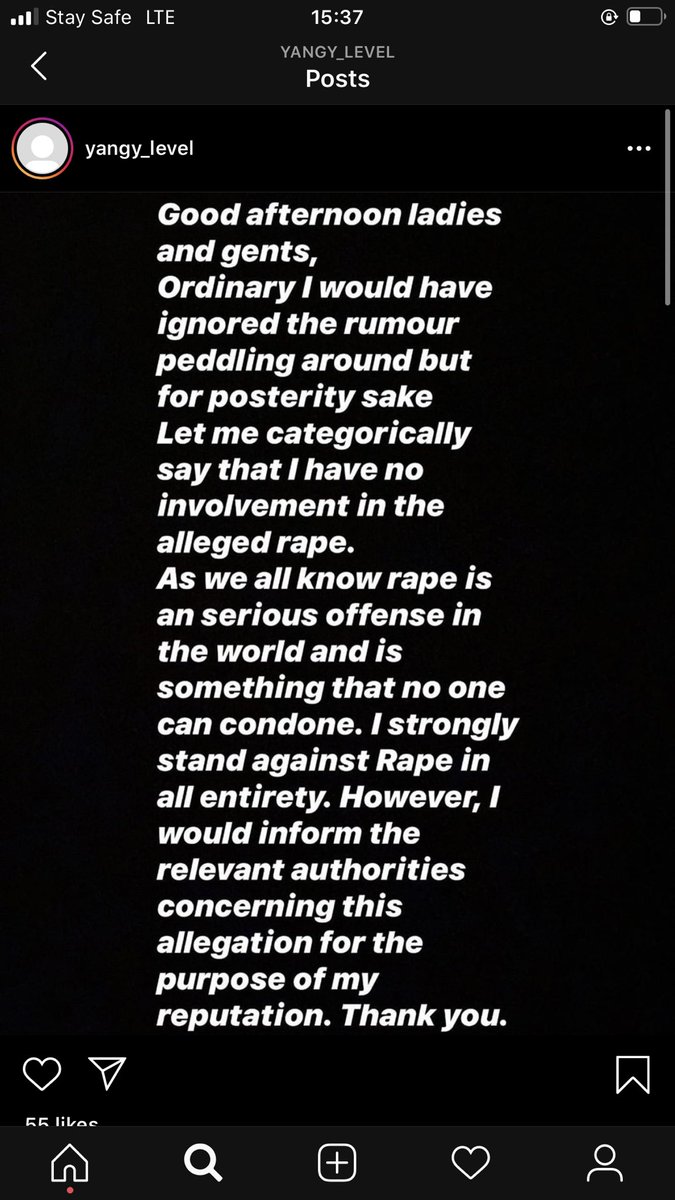 “This guy I’m talking about, we used to be friends till he raped me and his excuse was that he was tempted. Please, I want you to tell as many girls that are going to see this that the guy that calls himself Yangy is a rapist and they should beware of him.”