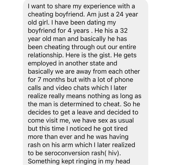“I want to share my experience with a cheating boyfriend. Am just a 24-year-old girl. I have been dating my boyfriend for 4 years . He his a 32 year old man and basically he has been cheating through out our entire relationship. Here is the gist. He gets employed in another state and basically we are away from each other for 7 months but with a lot of phone calls and video chats which I later realize really means nothing as long as the man is determined to cheat. So he decides to get a leave and decided to come visit me, we have s3x as usual but this time I noticed he got tired more than ever and he was having rash on his arm which I later realized to be seroconversion rash( hiv). Something kept ringing in my head that he could have got infected so I grab home test kits I had dormantly kept around the house and I test him for malaria and hiv. Ceetee the hiv test was reactive and I realized we had just had unprotected sexual intercourse.