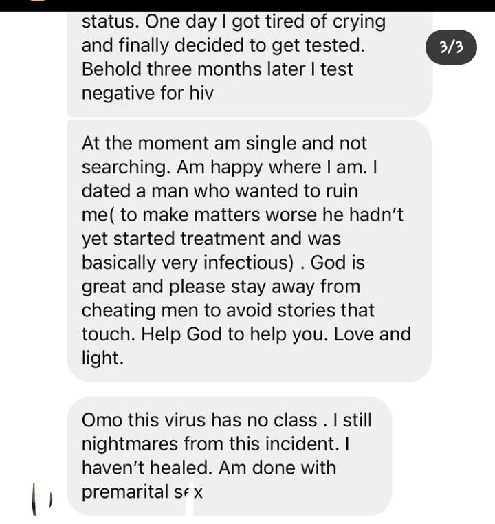 He didn’t even seem bothered. This seems like a movie it’s not. Being a medical student I call one of the doctors who works at the teaching hospital ( he’s my lecturer and mentor). I then rushed to the hospital and got a tin of tablets called PEP And had my first dose after 12 hours. It was not an easy journey of 30 days of anti hiv tablets simply because I loved a man . Three months of endless prayers and crying, stress and hardships passed. I was literally loosing my mind. I used to cry day and night because I didn’t know my hiv status. One day I got tired of crying pertaining to my status. One day I got tired of crying and finally decided to get tested. Behold three months later I test negative for hiv