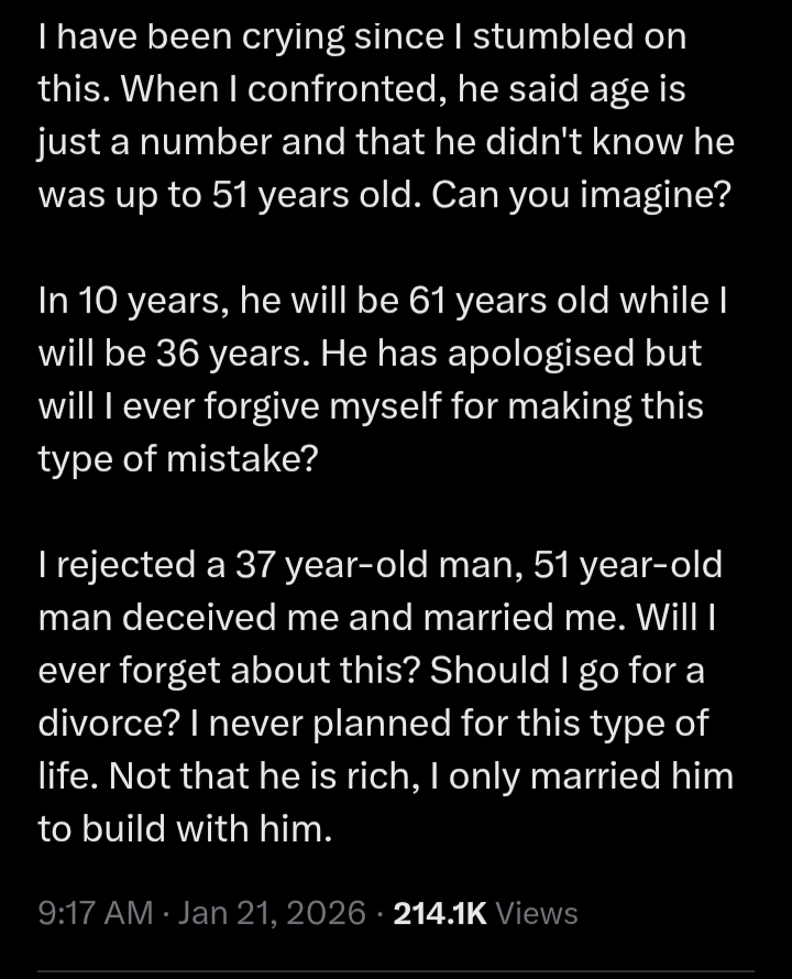 A 26-year-old newly married woman has stirred mixed reactions online after revealing that her husband allegedly lied about his age before their marriage.