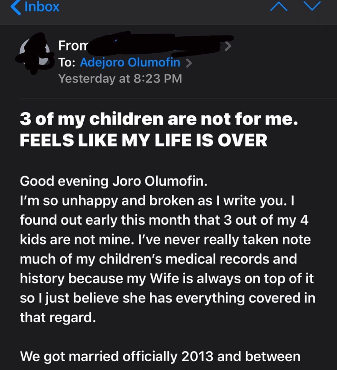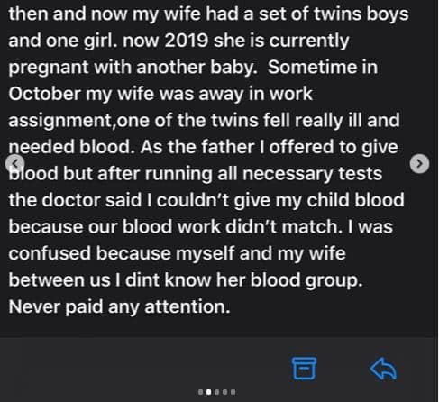 “Good evening Joro Olumofin. I’m so unhappy and broken as I write you. I found out early this month that 3 out of my 4 kids are not mine. I’ve never really taken note much of my children’s medical records and history because my Wife is always on top of it so I just believe she has everything covered in that regard. We got married officially 2013 and between then and now my wife had a set of tins boys and one girl. Now 2019 she is currently pregnant with another baby. Sometime in October my wife was away in work assignment, one of the twins fell really ill and needed blood. As the father I offered to give blood but after running all necessary tests the doctor said I couldn’t give my child blood because our blood group didn’t match. I was confused because myself and my wife between us I didn’t know her blood group. Never paid any attention.