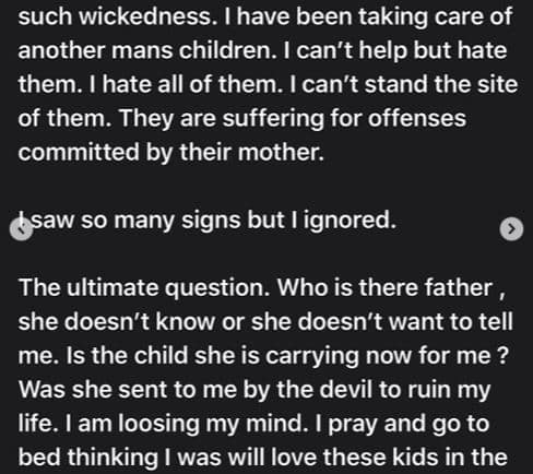 To cut the long story short, that was the day everything fell apart. I took the other 2 children to the hospital the next day and asked that the doctor run a DNA test on all 3 kids. After a week the result came and the 3 kids aren’t mine. There is no way to know about the last child my wife is carrying until she puts to bed. This is a woman who I have given everything, is it cars? Money? Businesses? Anything she wants I provide. She is the envy of all her friends. I have not touched another woman since we got married and she repays me with such wickedness. I have been taking care of another mans children. I can’t help but hate them. I hate all of them. I can’t stand the site of them. They are suffering for offenses committed by their mother. I saw so many signs but I ignored. The ultimate question. Who is there father, she doesn’t know or she doesn’t want to tell me. Is the child she is carrying now for me? Was she sent to me by the devil to ruin my life. I am loosing my mind. I pray and go to bed thinking I will love these kids in the morning but in the morning I hate them more than I slept. It is so hard for me. I am in serious pains. Please do dna test your children. Don’t invest in Bastard children like I did. Some people will love them I praying for God’s strength. The twins celebrate there birthday next week. I am sad and happy I won’t be a part of their life.”