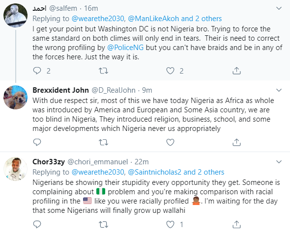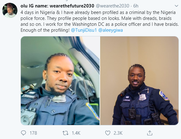 “4 days in Nigeria & I have already been profiled as a criminal by the Nigeria police force. They profile people based on looks. Male with dreads, braids and so on. I work for the Washington DC as a police officer and I have braids. Enough of the profiling! @TunjiDisu1 @aleeygiwa”