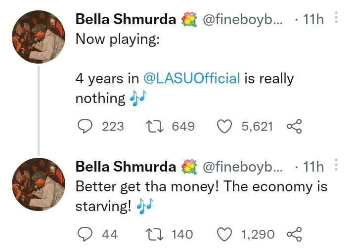 Bella Shmurda, in response, made light of the situation, stating that four years at Lagos State University is nothing and that it is better to work because the economy is suffering, which is true in some ways but not in others.