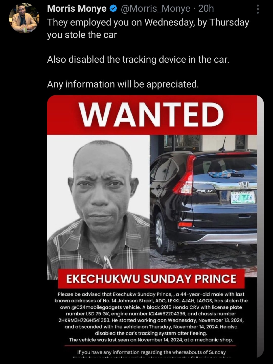 “Please be advised that Ekechukwu Sunday Prince, a 44-year-old male with the last known address of No. 14 Johnson Street, Ado, Lekki, Ajah, Lagos, has stolen the company @C24mobilegadgets vehicle: a black 2016 Honda CRV with license plate number LSD 75 GK, engine number K24W92204236, and chassis number 2HKRM3H72GH541353. He started working on Wednesday, November 13, 2024, and absconded with the vehicle on Thursday, November 14, 2024. He also disabled the car’s tracking system after fleeing. The vehicle was last seen on November 14, 2024, at a mechanic shop.”