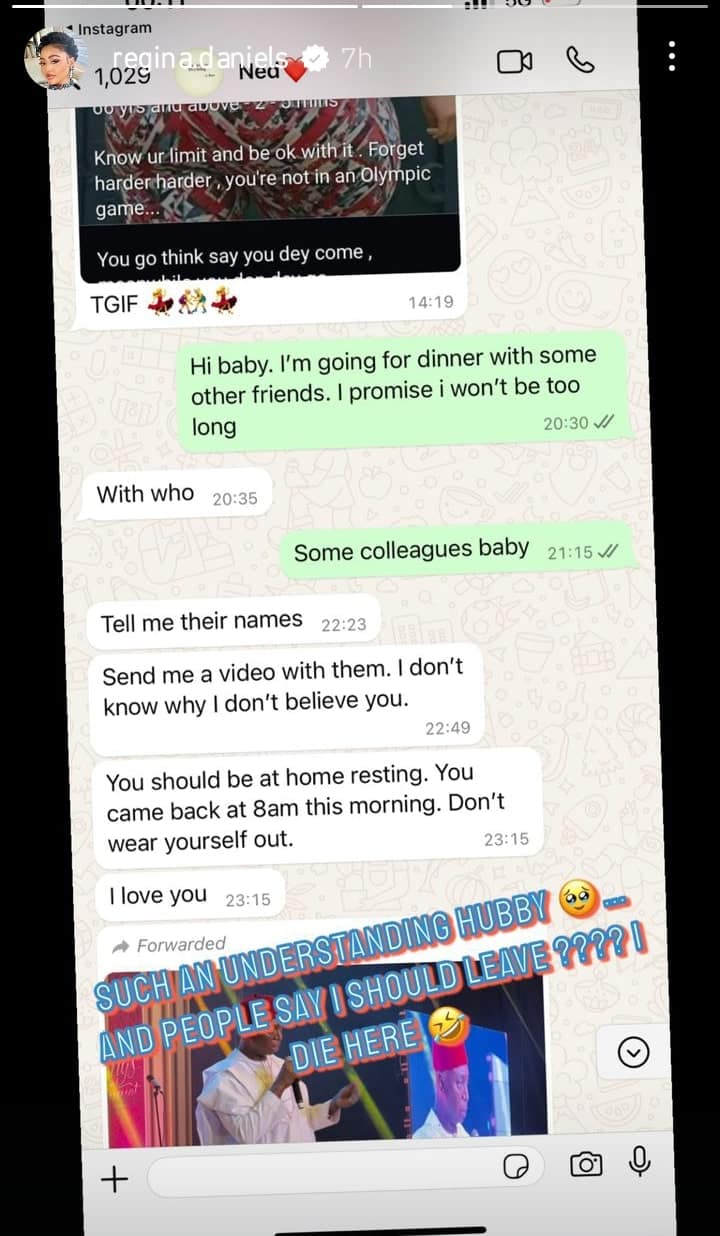 Nollywood actress, Regina Daniels sparks a buzz after sharing a private chat with her husband, Ned Nwoko where he complained about his age and a certain ‘Olympics Game.’