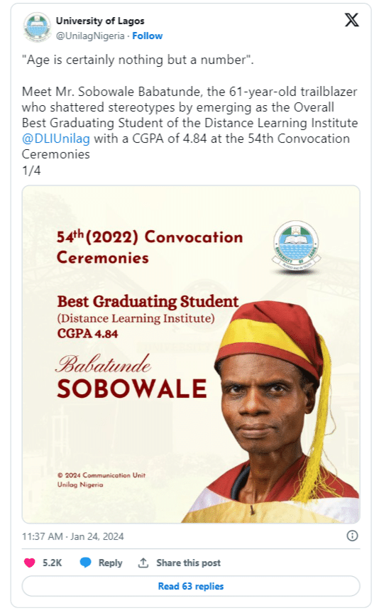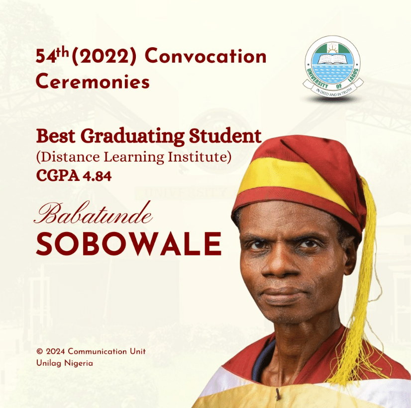 A 61-year-old Nigerian man, Sobowale Babatunde has emerged as the overall best graduating student from the University of Lagos Distance Learning Institute (UNILAG).