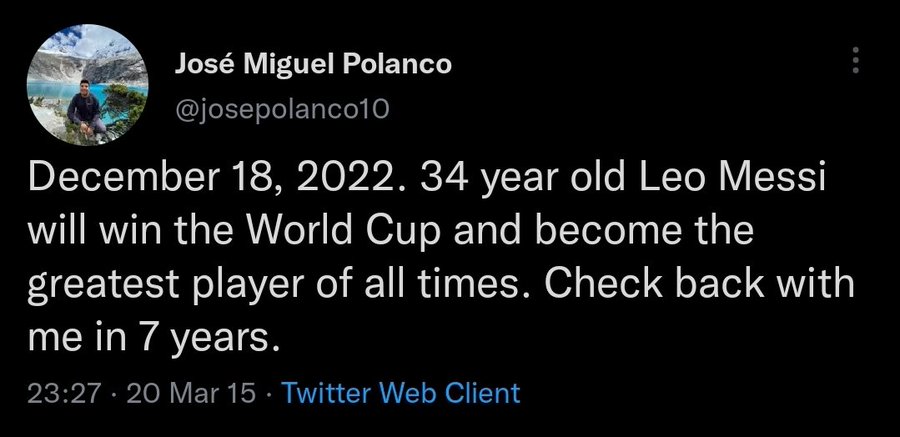 He tweeted, “December 18th, 2022. 34-year-old Leo Messi will win the World Cup and become the greatest of all times. Check back with me in 7 years”.