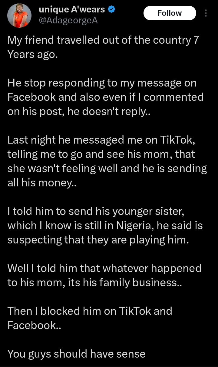 “7 years ago”- Lady shares why she blocked abroad-based friend who requested her help