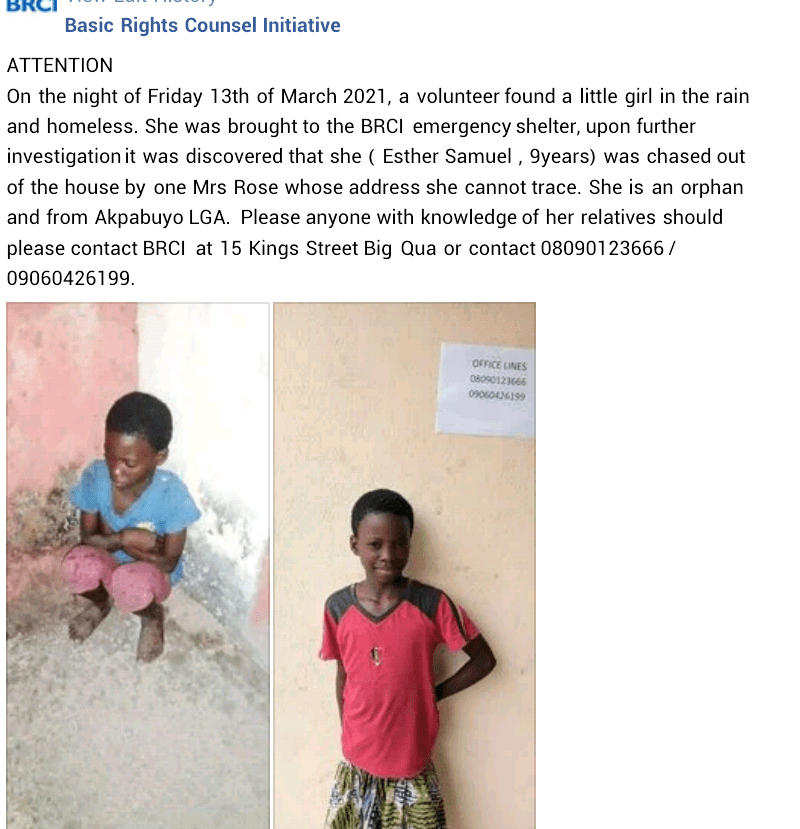 “On the night of Friday of March 2021, a volunteer found a little girl in the rain and homeless. She was brought to the BRCI emergency shelter, upon further investigation it was discovered that she ( Esther Samuel, 9years) was chased out of the house by one Mrs. Rose whose address she cannot trace. She is an orphan and from Akpabuyo LGA. Please anyone with knowledge of her relatives should please contact BRCI at 15 Kings Street Big Qua or contact 08090123666 / 09060426199”
