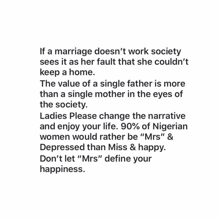 “(3)Emotional Abuse… If a marriage doesn’t work society sees it as her fault that she couldn’t keep a home. The value of a single father is more than a single father is more than a single mother in the eyes of the society. Ladies please change the narrative and enjoy your life. 90% of Nigerian women would rather be “Mrs” and depressed than Miss and happy. Don’t let “Mrs” define your happiness.””