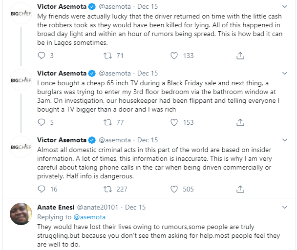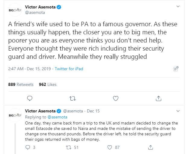 Nigerian IT expert, Victor Asemota took to Twitter to narrate how a driver nearly got the family of a former PA to a popular Governor killed with half information he shared with outsiders.