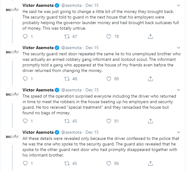 Victor disclosed that the family of the former PA to a Governor was attacked after the driver revealed sensitive information to the security guard.