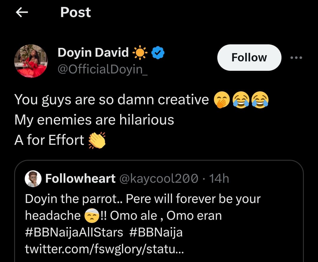 Not long after, Doyin responded with “You guys are so damn creative. My enemies are hilarious. A for Effort.”