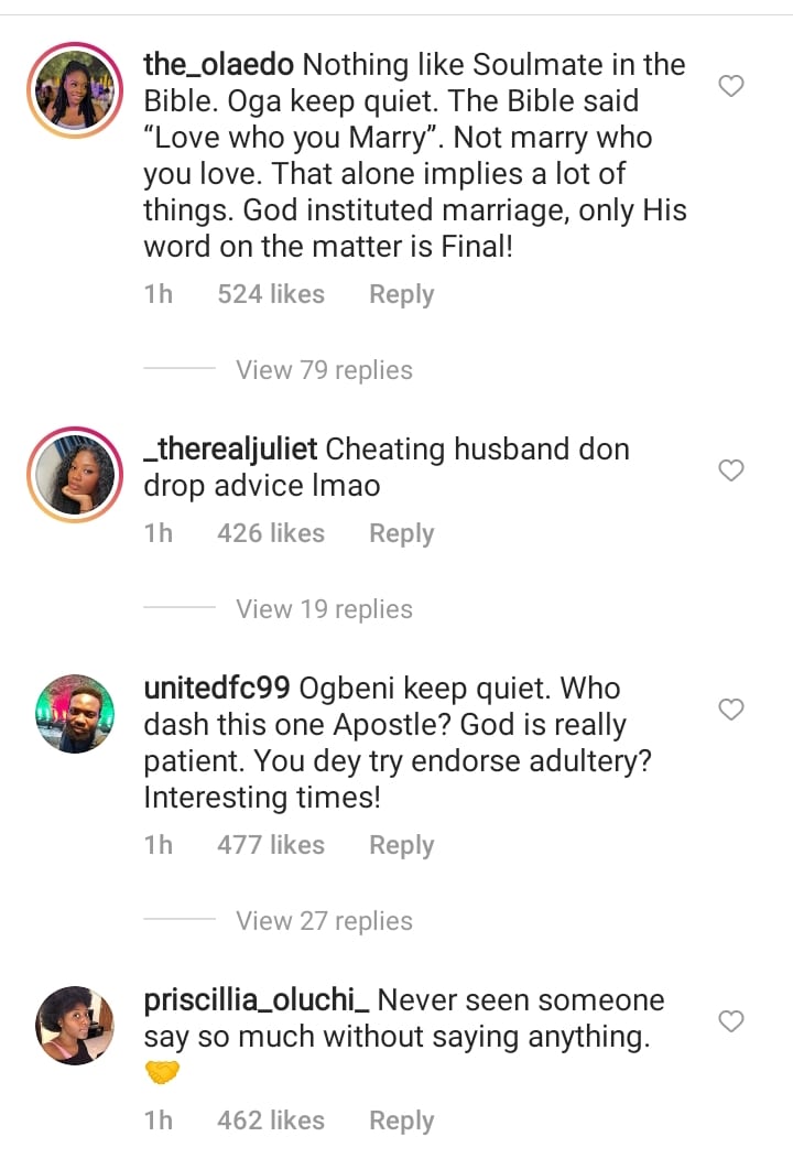 the_olaedo wrote: “Nothing like Soulmate in the Bible. Oga keep quiet. The Bible said “Love who you Marry”. Not marry who you love. That alone implies a lot of things. God instituted marriage, only His word on the matter is Final!”