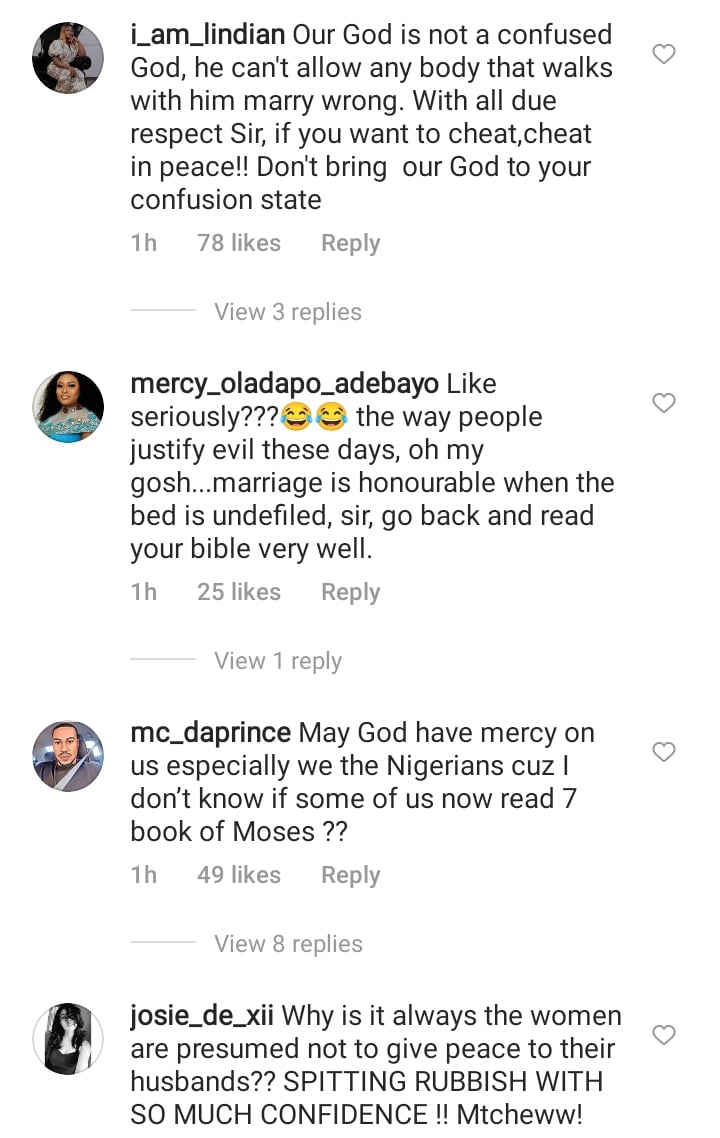 unitedfc99 wrote: “Ogbeni keep quiet. Who dash this one Apostle? God is really patient. You dey try endorse adultery? Interesting times!”