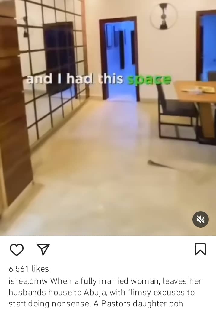 Israel DMW wrote: “When a fully married woman, leaves her husband’s house to Abuja, with flimsy excuses to start doing nonsense. A pastor’s daughter oooh”.
