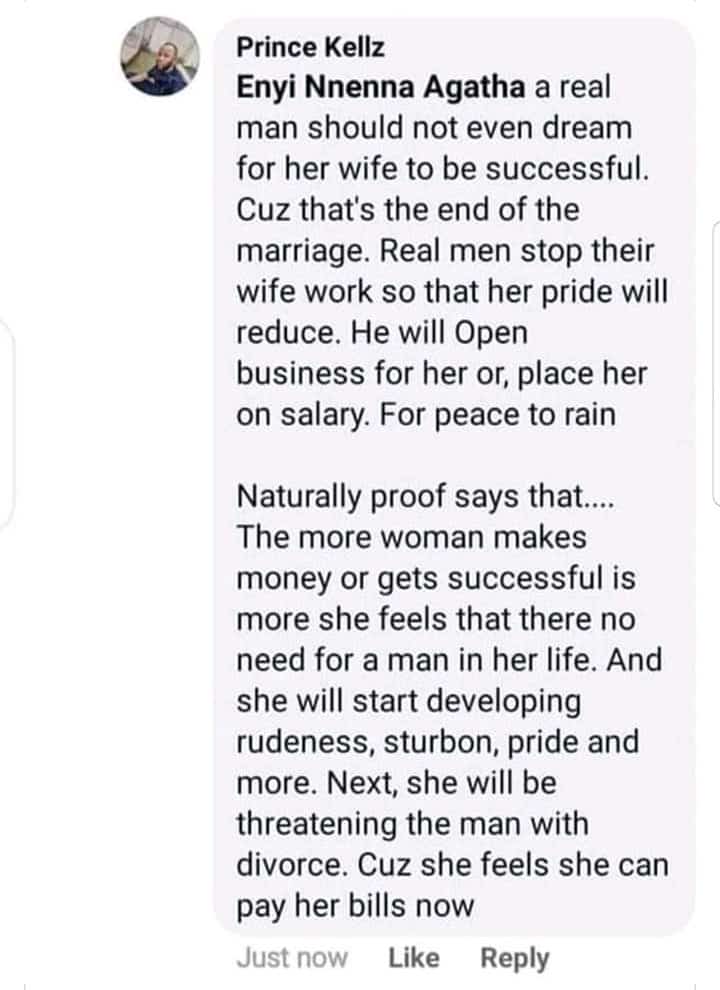 He wrote: “A real man should not even dream for her (sic) wife to be successful. Cuz that’s the end of the marriage.