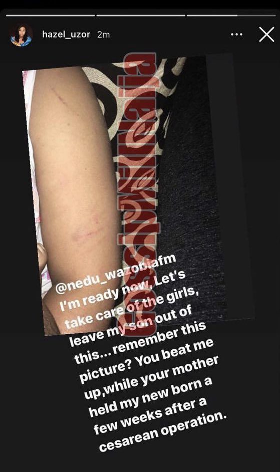 Taking to her Instagram story, Nedu Wazobia’s wife called him out for allegedly beating her up weeks after welcoming their child through surgery.