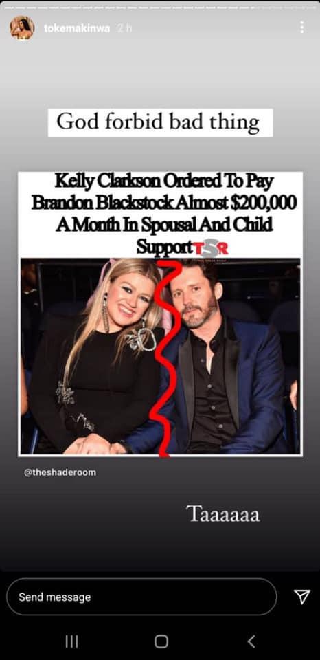 Media personality Toke Makinwa has reacted to a court judgment that ordered singer Kelly Clarkson to pay her ex-husband, Brandon Blackstock $200k monthly for spousal support.