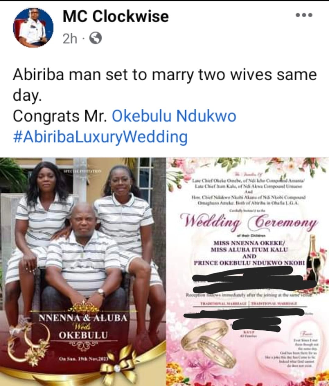 The announcement was made by a Facebook user, MC Clockwise who posted a flier about the double wedding while extending congratulations to the groom.