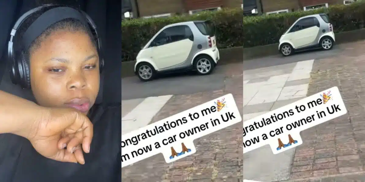 Abroad-based Nigerian lady congratulates herself as she shows off the first car she bought in the UK.