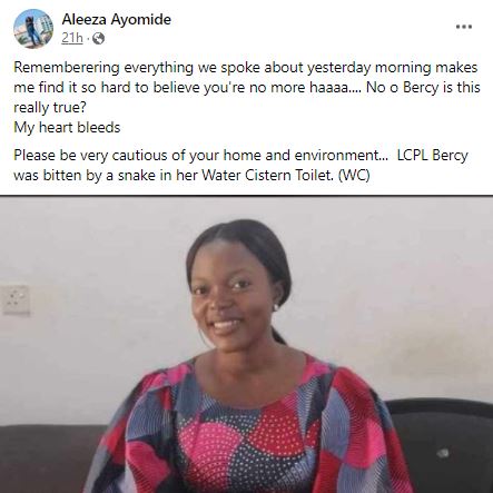 Please be very cautious of your home and environment… LCPL Bercy was bitten by a snake in her Water Cistern Toilet. (WC),” a friend of the deceased wrote.