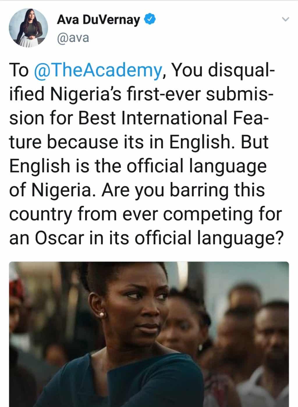 American filmmaker, Ava DuVernay took to Twitter to question the Academy’s decision to disqualify ‘Lion heart’ from the list of entries for the Oscars Award, insisting that English is Nigeria’s official language.