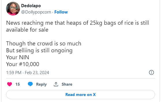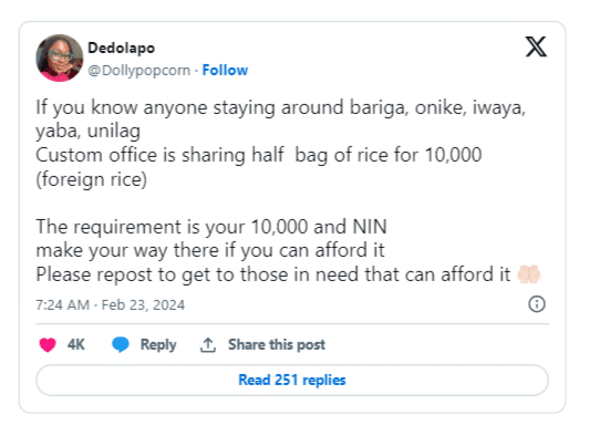 In her tweet on February 23, 2024, she updated Nigerians on an initiative by the Nigeria Customs Service, offering half a bag of foreign rice for just N10,000.