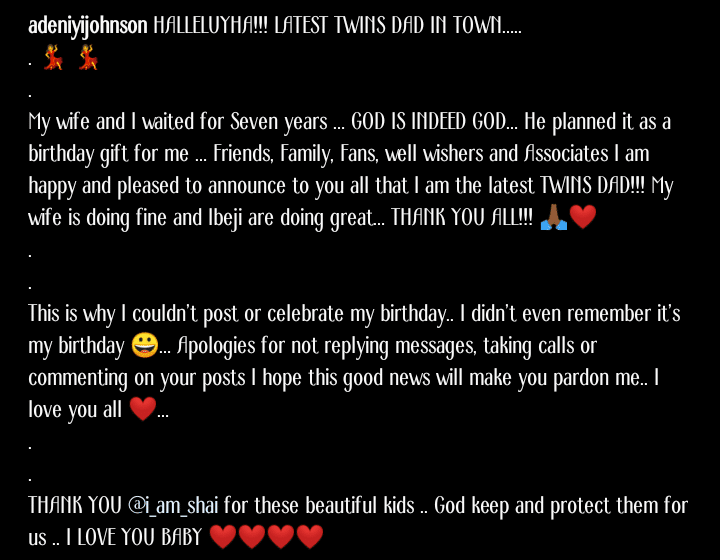 “HALLELUYHA!!! LATEST TWINS DAD IN TOWN. My wife and I waited for Seven years … GOD IS INDEED GOD… He planned it as a birthday gift for me … Friends, Family, Fans, well wishers and Associates I am happy and pleased to announce to you all that I am the latest TWINS DAD!!! My wife is doing fine and Ibeji are doing great… THANK YOU ALL!!! 🙏🏾❤️