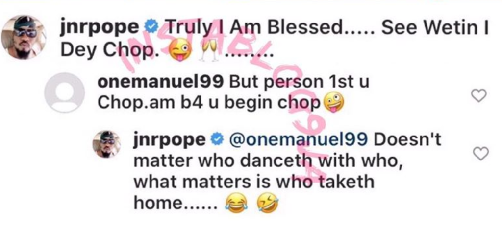 Reacting to the comment, Junior Pope wrote; “Doesn’t matter who danceth with who, what matters is who taketh home”