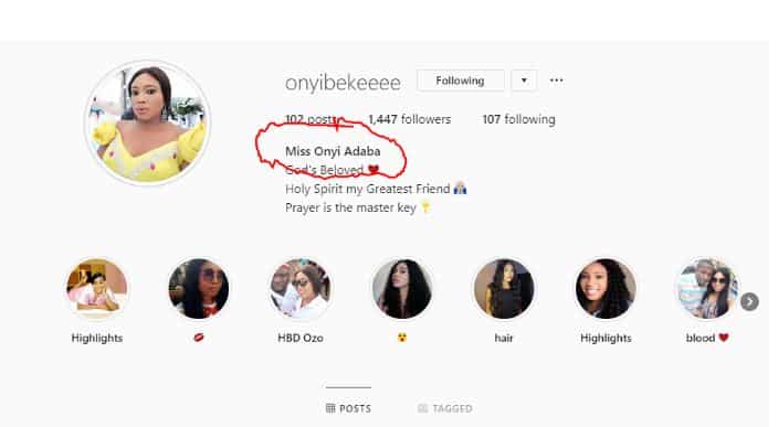She has also struck out her “Mrs” title, reverting to Miss Onyi Adaba.