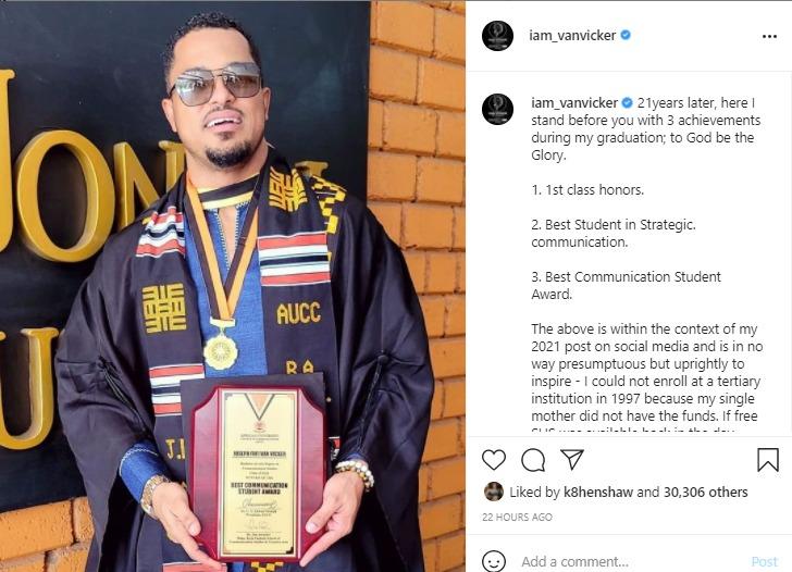 Popular Ghanaian actor Van Vicker finally graduates with first-class Honors, 21 years after his mates got admission to study different courses of their choice.